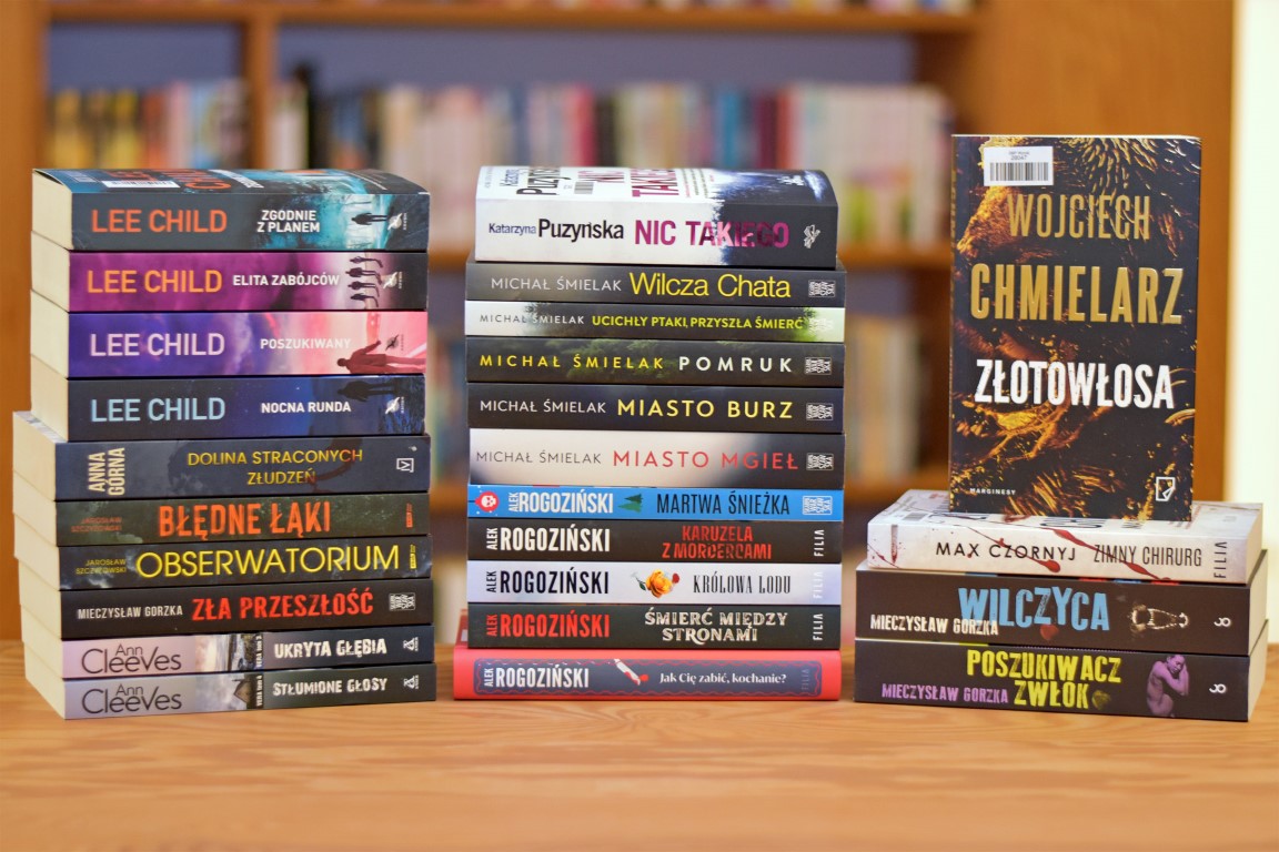 Jest to zdjęcie zrobione na wprost, przedstawiające trzy pionowe stosy książek w twardych i miękkich okładkach, stojące przed tłem z regałów wypełnionych innymi książkami.
